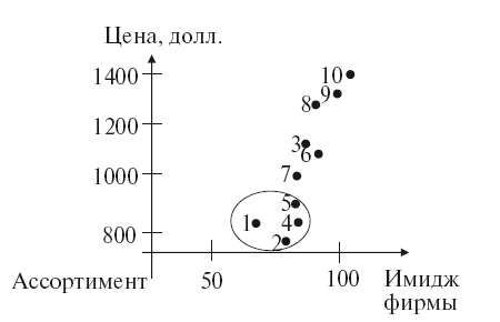 2. Составляем несколько двухкоординатных карт с использованием различных сочетаний из выбранных характеристик: цена-качество; качество—ассортимент; цена—ассортимент; цена-имидж фирмы.