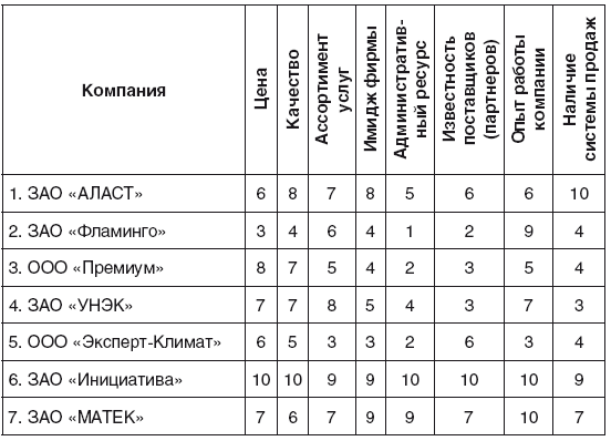 1. Выбираем важнейшие потребительские характеристики (по мнению потребителей) предприятий отрасли, например: цена, качество, ассортимент, имидж фирмы.