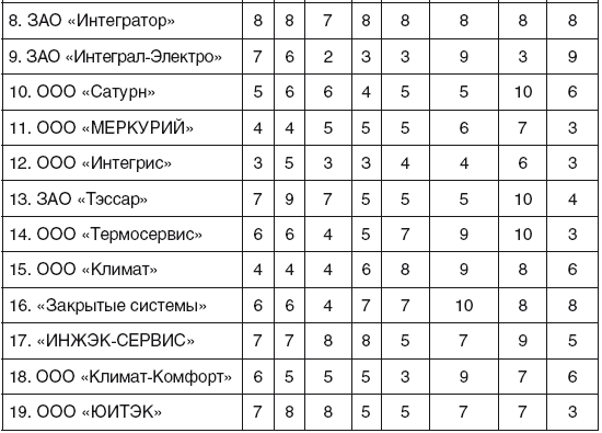 Приведем еще один пример выделения стратегической группы конкурентов для компании, занимающейся оказанием строительных услуг (охранная сигнализация, пожарная сигнализация, электропроводка и др.) в строящихся объектах жилого и коммерческого строительства. Здесь необходимо было выстроить 10 двухкоординатных карт, чтобы выявить конкурентов, попавших в одно пространство с исследуемой компанией.