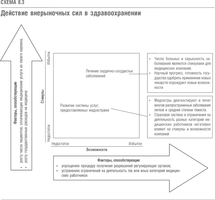 Внерыночные силы играют крайне важную роль в формировании инноваций в здравоохранении, и это совершенно неудивительно. Отрасль очень велика и неоднородна, и потому разобраться в действии этих сил – задача для решительных людей. В настоящий момент наши исследования продолжаются, и одна из наших целей – найти пути внедрения в эту отрасль такой организационной системы, которая будет в большей степени благоприятствовать появлению и развитию инноваций. Тем не менее наша модель стимулов и возможностей на достаточно высоком уровне обобщения позволяет объяснить последние тенденции развития отрасли, которые так или иначе влияют на возникновение инноваций.
