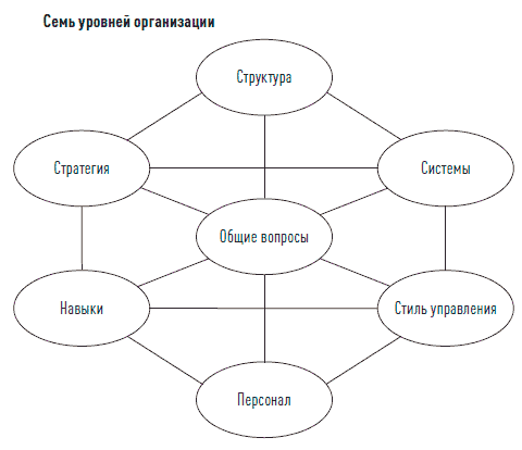 Модель, разработанная консультантами компании McKinsey&Co. совместно с Гарвардским университетом, вносит ясность в эту проблему. Эта модель, которая называется «7S», включает семь независимых уровней организации, в совокупности определяющих направление и успех в достижении целей компании: