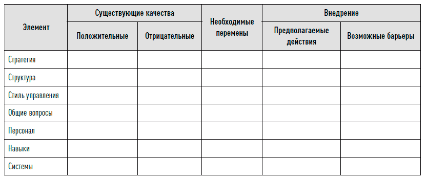 Модель «7S» следует считать основой перемен в управлении. Она дает вам перечень областей, которые требуют пристального внимания и интеграции для успешного применения стратегии.