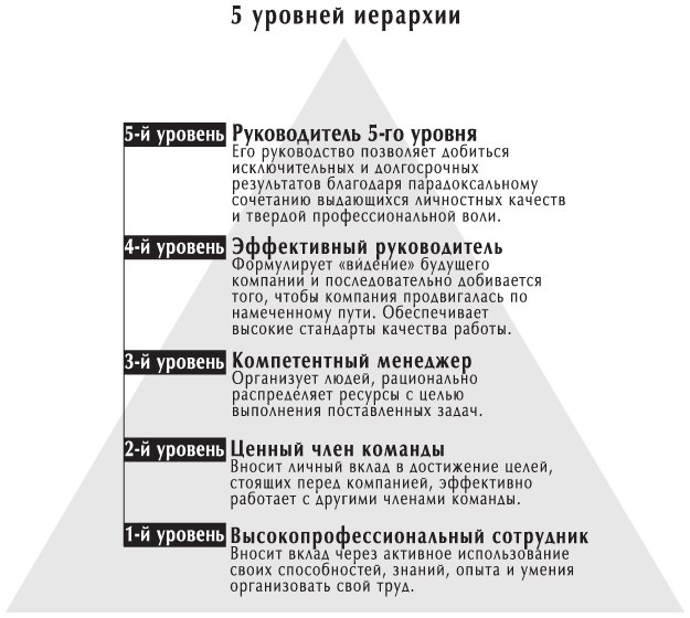 Термин «5-й уровень» представляет высший уровень иерархии способностей к руководству, созданной нами в ходе исследования (см. диаграмму «5 уровней иерархии»). Нет необходимости последовательно переходить от 1-го уровня до 5-го: развить качества руководителей низших уровней можно и позже. 5-й уровень включает в себя все качества, относящиеся и к более низким ступеням пирамиды. Я не собираюсь описывать все уровни иерархии, поскольку уровни с 1-го по 4-й самоочевидны и охарактеризованы другими авторами. Эта глава рассказывает об отличительных качествах, которыми обладают лидеры, превратившие хорошие компании в великие, то есть о тех чертах, которыми наделены только лидеры 5-го уровня.