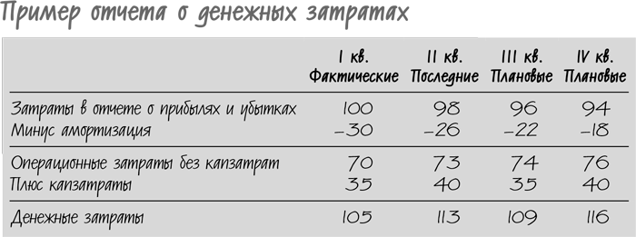 Для тех, кто далек от бухгалтерского учета, поясню, что есть разница между денежными затратами и затратами в отчете о прибылях и убытках. Это относится к активам (таким, как оборудование, транспортные средства, оснащение помещений, лицензии на объекты интеллектуальной собственности), которые берутся на учет и затем амортизируются за период более одного года. Если сегодня я покупаю компьютер за $3000 (т. е. несу реальные затраты в $3000), но считаю, что его срок службы составит три года, я учитываю его на балансе и затем ежегодно в течение трех лет списываю по $1000 на счет прибылей и убытков.