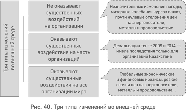 Одни и те же изменения по-разному сказываются на судьбе организаций. Для одних организаций это воздействие может быть позитивным, для других – негативным. Девальвация казахстанского тенге в 2009 и 2014 годах оказала существенное воздействие на местные (локальные) организации, а также на организации приграничных областей соседних государств. Для казахстанских экспортеров эти воздействия были позитивными, тогда как для импортеров – наоборот, негативными.