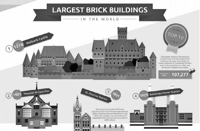 Рис. 8.3. Фрагмент инфографики «10 самых больших кирпичных зданий мира». Полностью инфографику можно посмотреть по ссылке http://visual.ly/largest-brick-buildings-world