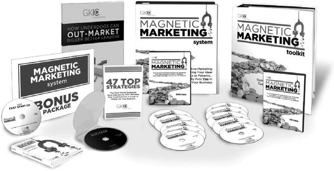 Рис. 8.7. Комплект материалов курса MagneticMarketing («Маркетинг притяжения») Дэна Кеннеди включает книгу, папки с текстами и примерами, диски с аудио– и видеозаписями, методички и дополнительные бонусы. Источник: gkic.com