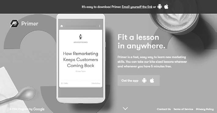 Мобильные приложения. Могут использоваться для обучения и развлечения целевой аудитории. Google недавно выпустил мобильное приложение Primer (рис. 8.8). Загрузив его на мобильный, можно бесплатно проходить короткие уроки (5–7 минут) по таким темам, как реклама в Google AdWords, юзабилити сайта, аналитика, ретаргетинг.