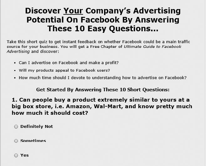 Кроме тестов, призванных привлечь посетителей сайта, есть тесты с конкретной практической целью. Например, на сайте консультанта по интернет-маркетингу Перри Маршалла предложен тест «Насколько для вас подойдет реклама в Facebook?» (рис. 8.11). Ответив на десять простых вопросов, вы получаете оценку потенциала рекламы в Facebook для вашей компании.