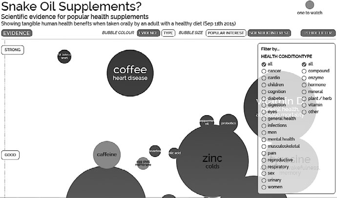 Динамические или интерактивные визуализации. Интернет-технологии позволяют представлять сложные данные и тренды в понятном виде и вовлекать пользователей во взаимодействие с ними. Например, на сайте informationisbeautiful.net опубликованы результаты анализа медицинских метаисследований, насколько действительно полезен для здоровья тот или иной ингредиент, пользующийся народной славой или рекомендуемый нетрадиционной медициной. Размер кружков показывает степень интереса к данному веществу, а расположение на диаграмме – подтвержденную исследованиями пользу, отсутствие влияния или даже вред.