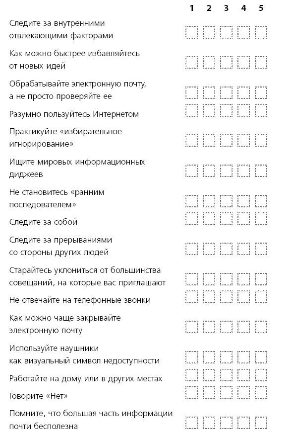Давайте составим ваш личный план действий по управлению вниманием и сосредоточенностью! Проанализируйте и оцените приемы управления вниманием и идеи, которые вы найдете на следующих страницах. Отделите то, чем вы уже пользуетесь, от того, что обязательно попробуете (и когда), что могли бы попробовать и чем не будете пользоваться никогда. Затем отберите три приема, которые могли бы быть вам полезны, и испробуйте их на практике.