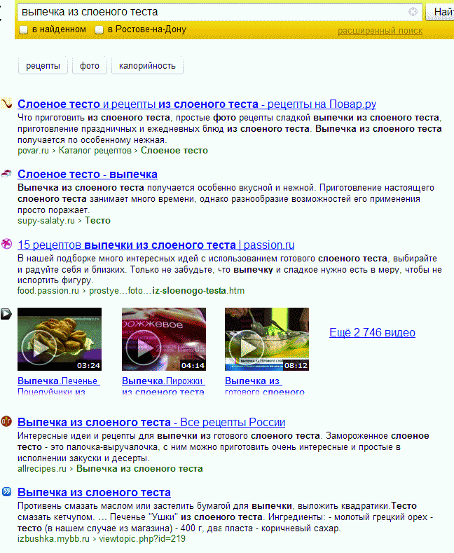 Допустим, мы вводим в графе поиска фразу «выпечка из слоеного теста»: