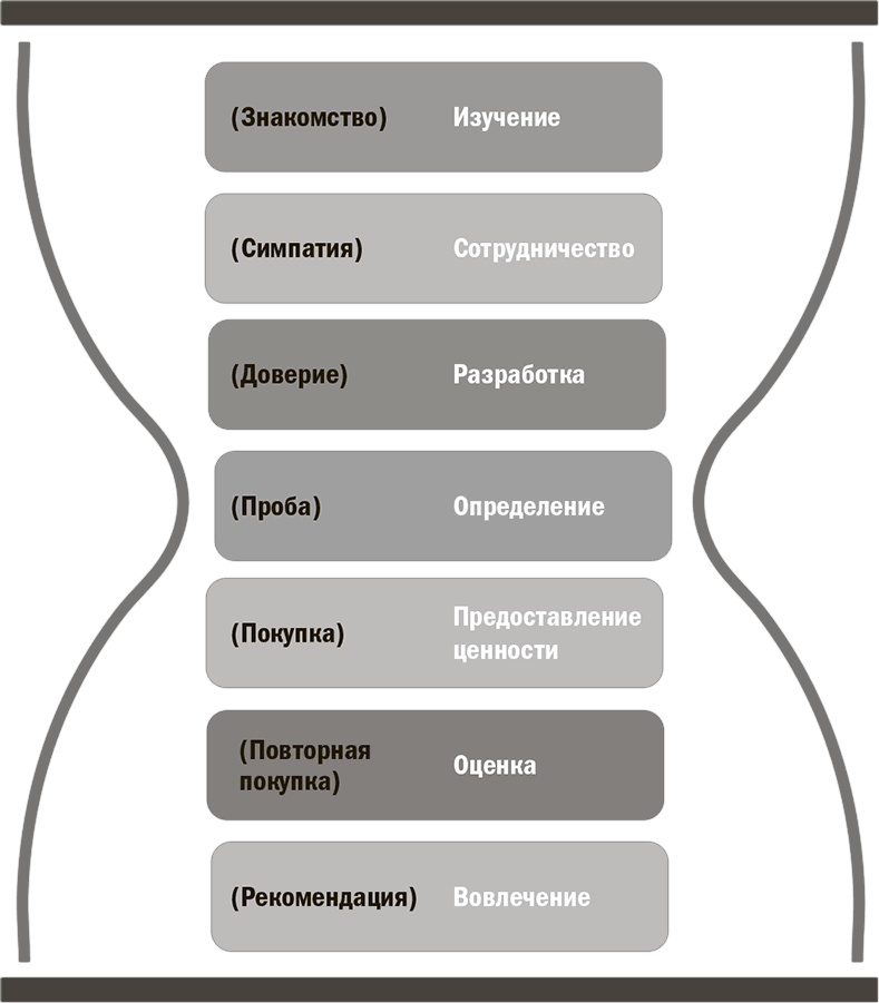 Последовательные этапы песочных часов продаж приведены ниже (в скобках рядом с каждым этапом я разместил соответствующие этапы песочных часов маркетинга, чтобы провести между ними определенные параллели):