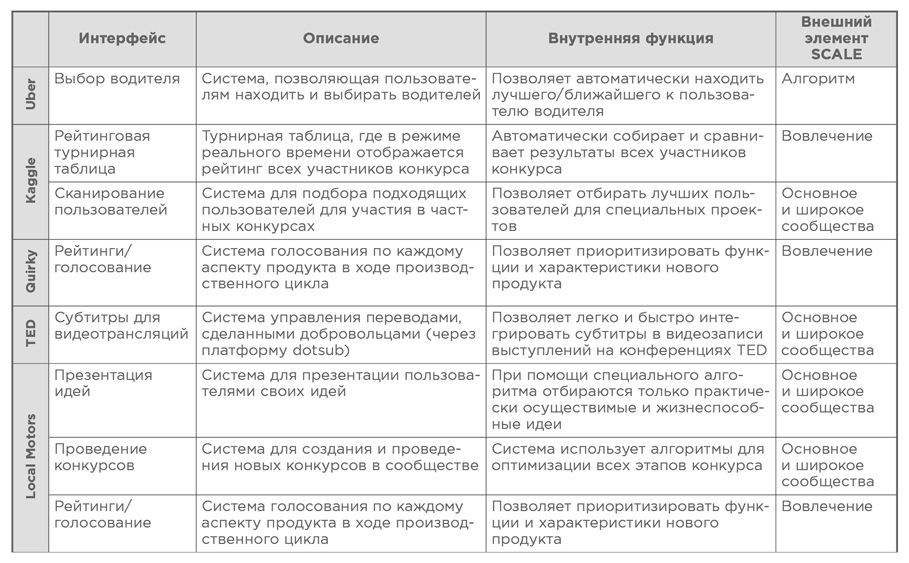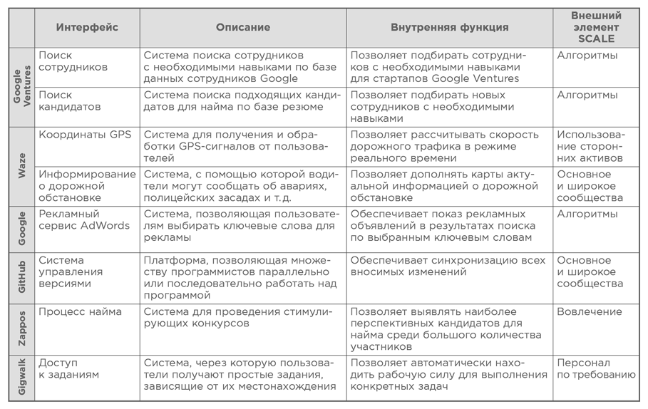 Для управления такой уникальной средой интерфейс Apple обладает внутренним редакционным советом, который изучает новые приложения и запросы на изменения, а также рекомендации других сотрудников компании, образующих неформальную сеть. О новых продуктах и политиках объявляется на конференциях WWDC (Всемирных конференциях для разработчиков на платформах Apple). Также компания использует сложный алгоритм для определения того, какие приложения лидируют в своих категориях и, следовательно, должны быть размещены на главной странице. Как и большинство интерфейсов ЭксО, этот процесс является уникальным для Apple. Ему не учат в бизнес-школах, и ни один эксперт не расскажет вам о том, как его создать. Тем не менее эти интерфейсы являются ключевыми механизмами, с помощью которых ЭксО удается достигать такого масштабирования. В таблице на странице 107 приведены некоторые примеры ЭксО и их интерфейсов.