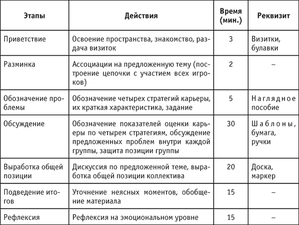Участникам игры предлагаются показатели оценки четырех стратегий карьеры руководителя, которые необходимо наполнить содержанием и отразить их в виде различных схем. Для этого консультанты раздают каждой подгруппе приготовленные заранее шаблоны, которые необходимо заполнить, чтобы получить схемы по предложенным стратегиям. На каждом шаблоне должно быть указано задание. Это позволит сконцентрировать внимание игроков на проблеме, избежать лишних вопросов, а также сэкономить время.