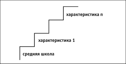 Наглядно стратегия образования может быть представлена в виде четырех (по количеству показателей) «лестниц», число ступеней в которых заданием не ограничено. Объем знаний указывается от низшей ступени – средняя школа – по возрастающей. Точкой отсчета мы выбрали среднюю школу, предполагая, что человек, не окончивший школу, руководителем быть не может. Характеристики управленческой культуры, умения использовать знания и самооценки потенциала образования указываются по степени значимости: от наиболее значимых к наименее значимым.
