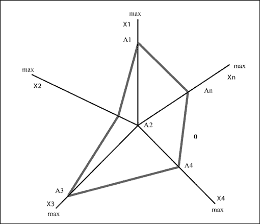 Например, в инновационной стратегии показатель восприятия руководителем своих полномочий представляет собой «лучевой график» (рис. 2, где лучи (Х1, Х2… Хn) являются характеристиками данного показателя, а отдаленность точек А1, А2… Аn от 0 показывает степень значимости Х1, Х2… Хn для описываемой стратегии карьеры руководителя.