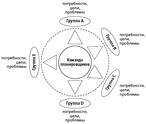 Полчаса мы потратили на то, чтобы разбить планирование на компоненты. Около 40 руководителей собрались в одном зале и распределились на группы (команды), каждая из которых отвечала за свою часть процесса: планировщики, инженеры и так далее. На белых стенах помещения каждая команда начертила диаграмму открытого мышления для конкретного этапа расчета бюджета. В центре группы вписали свою часть процесса, а вокруг зафиксировали имена исполнителей и названия команд, которых задействовала эта часть составления плана. Затем нарисовали треугольники, вершины которых смотрели наружу в каждом направлении, а рядом с каждым подразделением указывалось, что его потребности, цели и проблемы принимаются во внимание.