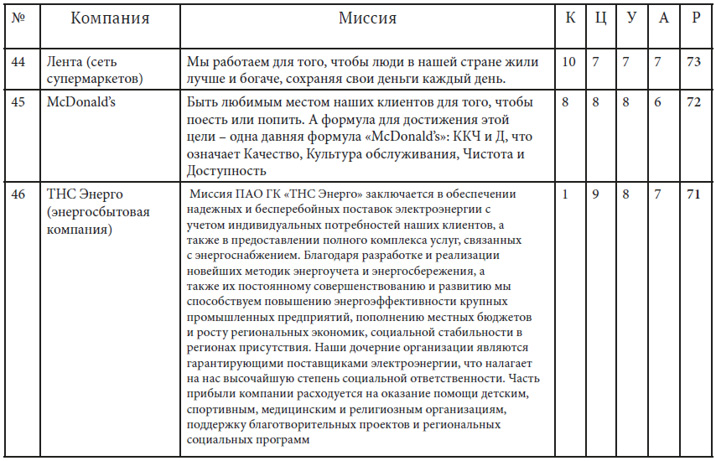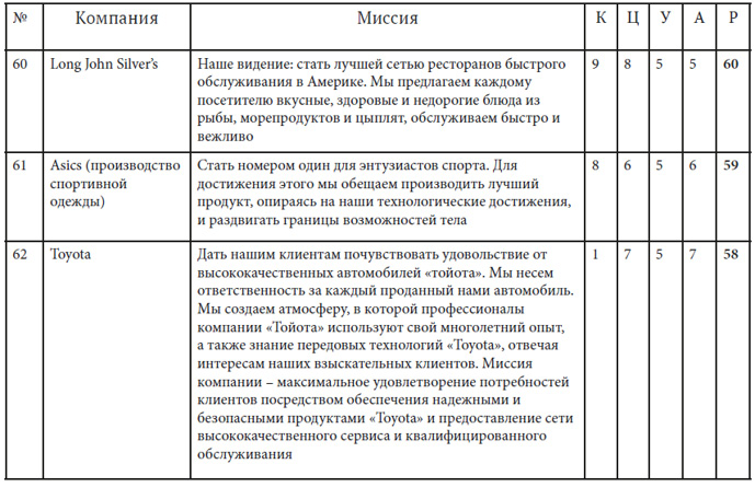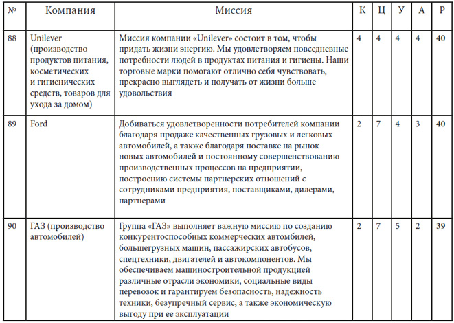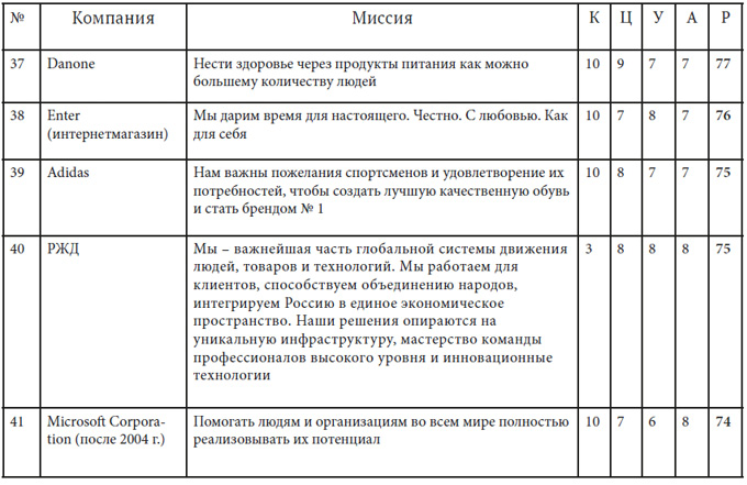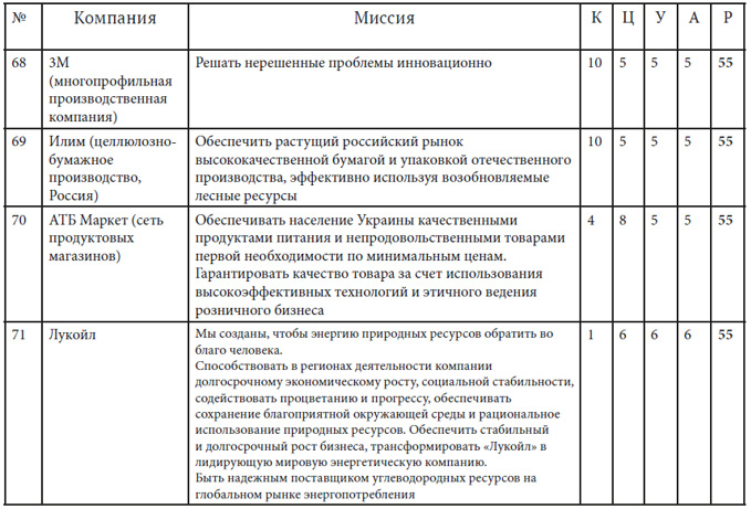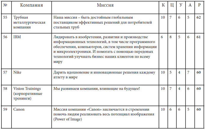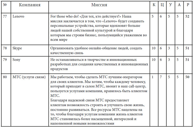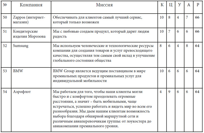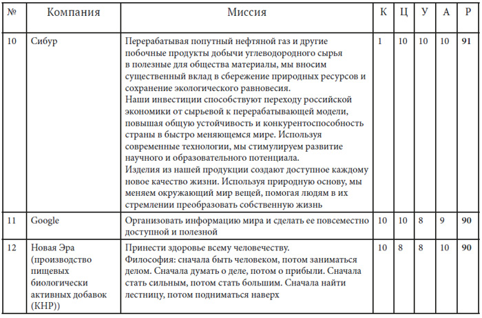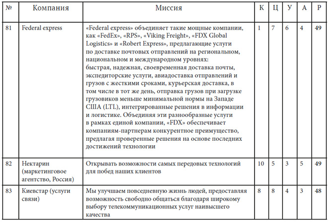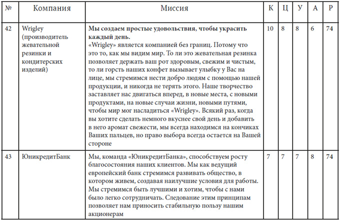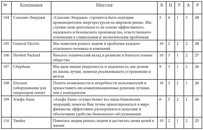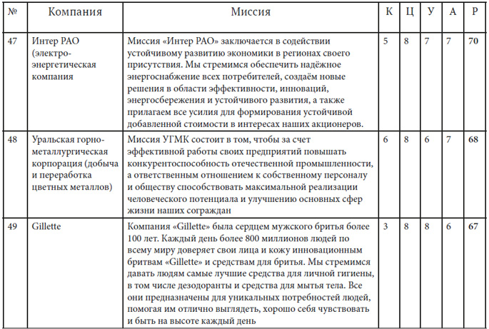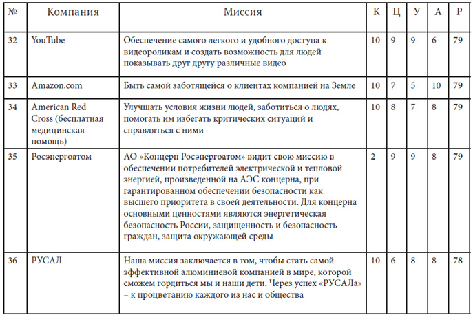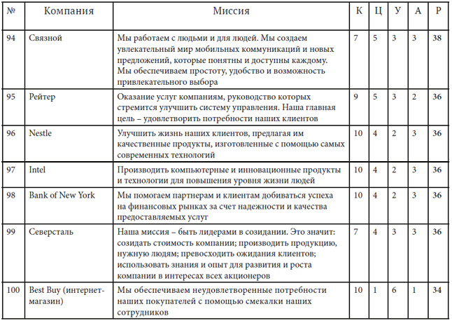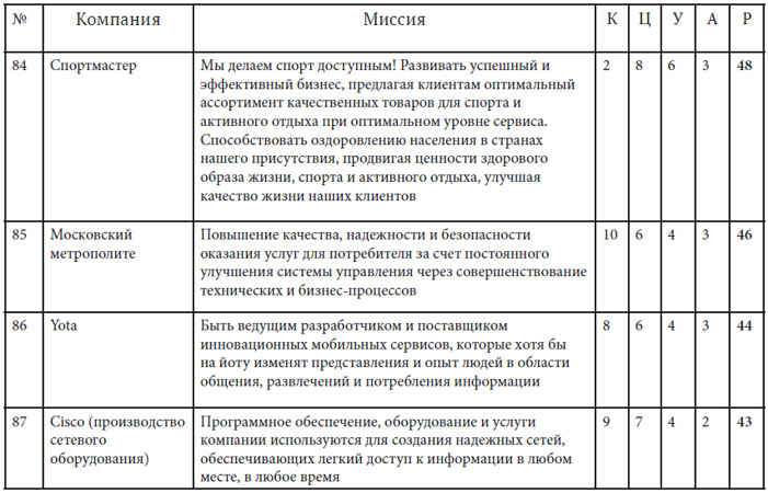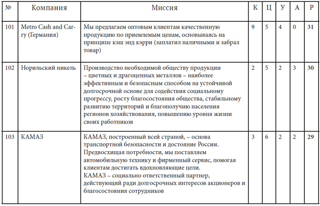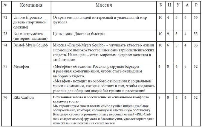 Обозначения столбцов таблицы: К – краткость, Ц – ценность, У – уникальность, А – амбициозность, Р – итоговый рейтинг.