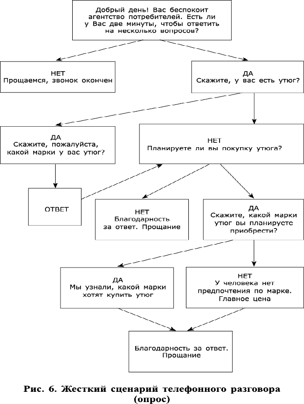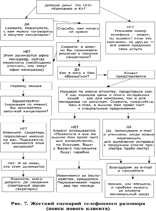 Этот сценарий-алгоритм (см. рис. 7) должен жестко соблюдаться – слово в слово. Безусловно, глупо его не менять, если ты чувствуешь, что в определенном блоке происходит сбой. Эти блоки меняются и дописываются в зависимости от реакции клиента.