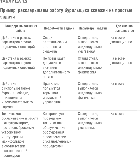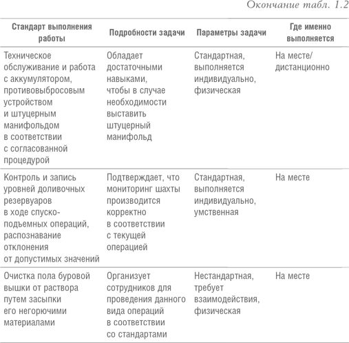 В табл. 1.2 наглядно показано, как можно разложить служебные обязанности бурильщика скважин на отдельные элементы. Помимо трех основных параметров, которые мы обсуждали ранее, там также содержится информация о том, должны ли те или иные операции выполняться на месте или дистанционно.