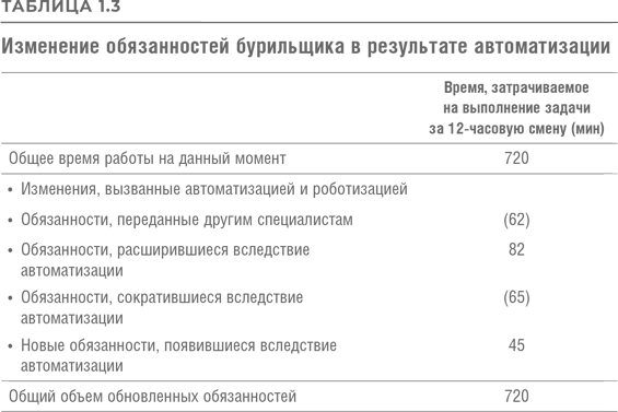 Проведя столь подробный разбор деятельности данного специалиста, руководители компании смогли оптимизировать процесс автоматизации и осознать, как она повлияет на различные виды задач. В табл. 1.3 представлены результаты раскладывания работы бурильщика на составляющие, внедрения автоматизации и обновления его служебного функционала. В данном случае автоматизация позволила передать определенный объем задач другим специалистам, исключив ряд прежних обязанностей и добавив новые, а также создать новые виды деятельности.