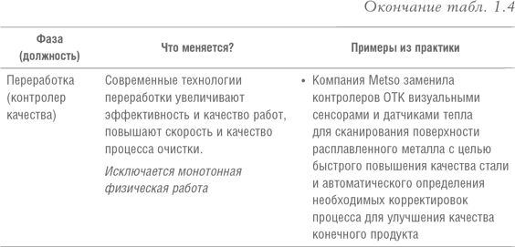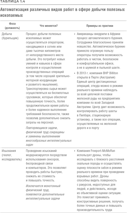 А теперь мы более детально рассмотрим, как автоматизация сказывается на цепочке ценности в сфере добычи полезных ископаемых, и обсудим несколько случаев из производственной практики. В табл. 1.4 на реальных примерах описывается, каким образом автоматизация изменила деятельность представителей ряда профессий в горнодобывающей промышленности.