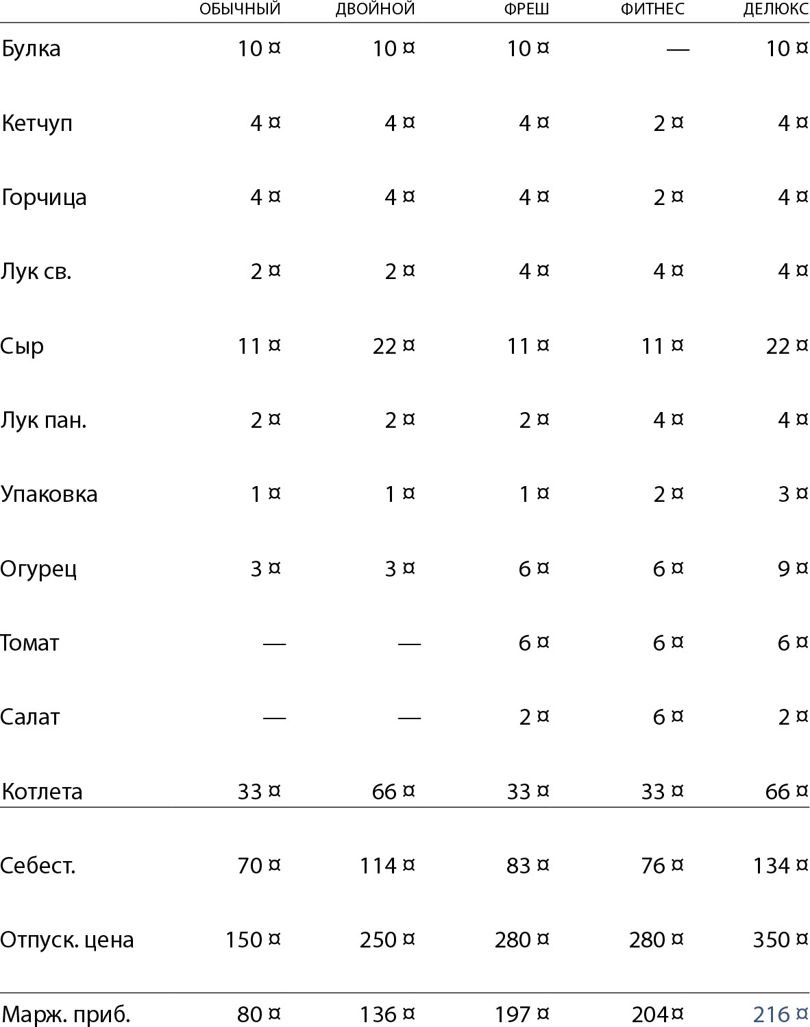 Ингредиенты обычного бургера стоят Коле 70 рублей, продает Коля бургер за 150, зарабатывает 80. Попробуем посчитать, сколько он будет зарабатывать, если предложить гостям на выбор несколько вариантов бургера с разной рецептурой.
