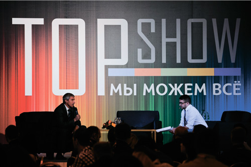 Генеральный директор в легкой и непринужденной форме ответил на вопросы ведущего и вопросы из зала. Он рассказал не только про бизнес-показатели и стратегию компании, но и коснулся личных тем и собственных планов на будущее. TOPShow шло с перерывами на рекламу, транслировались видеоролики, подготовленные командами из разных регионов страны. Зрителям в зале было предложено проголосовать с помощью sms за наиболее понравившийся ролик.