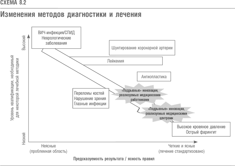 Здесь надо сделать одно важное замечание. Даже если некоторую лечебную методику применяют, следуя четким правилам, то все равно может сложиться ситуация, когда для реализации этой методики потребуются навыки специалиста, и тогда решение проблемы попадает в правый верхний угол схемы. Например, операция шунтирования в значительной мере стандартизована. Хирург, выполняющий операцию, следует четким правилам. И тем не менее это достаточно сложная процедура. Однако в большинстве случаев разработка четких правил (переход вправо по горизонтальной оси) ускоряет развитие более простых процедур, которые позволяют продвигаться в верхние сектора рынка менее квалифицированным категориям медицинских работников (переход вниз по вертикальной оси).