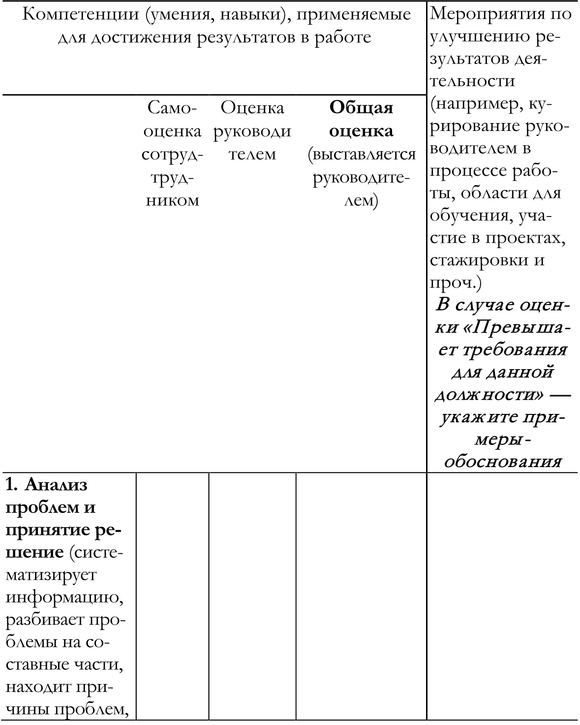 НО – Не оценивается; НП – неприемлемо; НР = нуждается в развитии; Э – эффективно; ПТ – превышает требования для данной должности; В – выдающиеся
