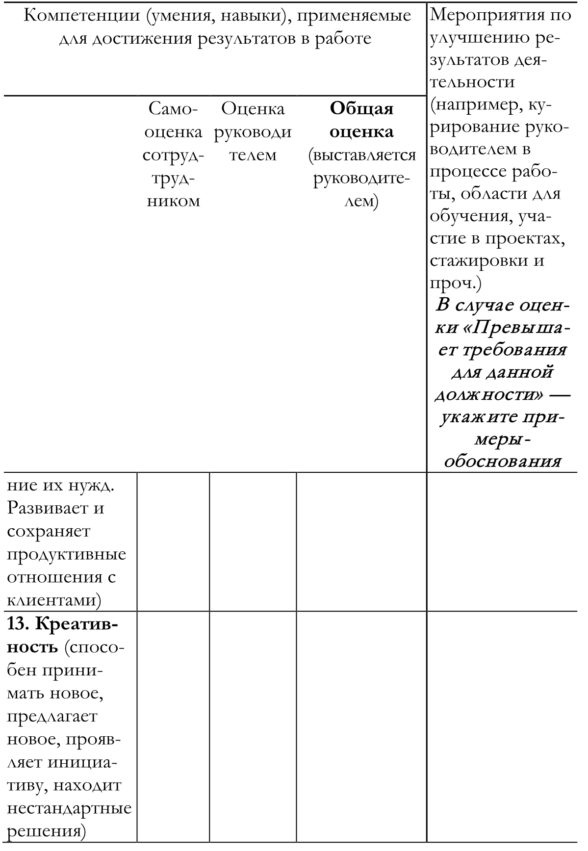 НО = Не оценивается; НП – неприемлемо; НР = нуждается в развитии; Э – эффективно; ПТ – превышает требования для данной должности; В – выдающиеся