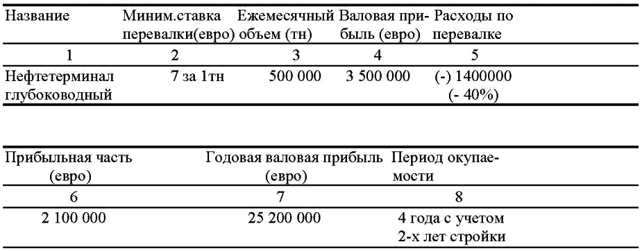 Примечание: при инвестировании более 150 000 000 рублей (4 300 000 евро) инвестор становится резидентом СЭЗ и освобождается на 6 лет от налогов на прибыль и имущество. Расходы по перевалке (-40 %) взяты по опыту эксплуатации нефтетерминала Лукойла в п. Ижевское Калининградской области.