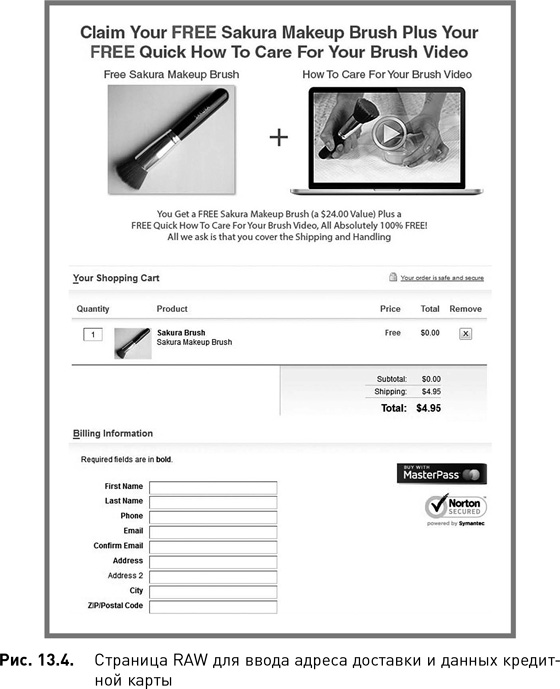 Как только покупатели выражают свое согласие, они перенаправляются на другую целевую страницу, где им предлагается возможность купить еще несколько кисточек и подписаться на рассылку, обучающую искусству макияжа (рис. 13.2 и рис. 13.3).