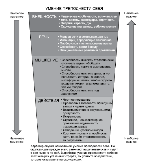 Умение преподнести себя – это далеко не только привлекательность и удачное первое впечатление. Умение преподнести себя основывается на физической, ментальной и эмоциональной сущности, а также на характере. Оно формирует мысли и чувства окружающих в отношении вас на протяжении всего периода их общения с вами. Когда люди относятся к вам благосклонно, вы заручаетесь их доверием. По мере того как другие тоже приобретают подобный опыт взаимодействия с вами, формируется молва, и перед вами открываются социальные и деловые возможности, ведущие к успеху в личной жизни и карьере.