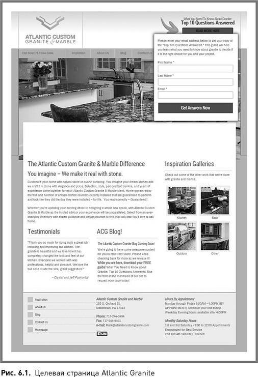 Для начала создайте список из 20 главных вопросов, которые задают потенциальные клиенты, после чего дайте простые ответы на них. В таком типе руководства вы начинаете процесс конверсии, отвечая на те вопросы, которые задал бы ваш потенциальный потребитель, если бы вы встретились лицом к лицу. Вы можете познакомиться с примером списка, созданного для одного из наших клиентов, поставщика гранита и мрамора, – «Десять главных вопросов о граните» (рис. 6.1 и рис. 6.2).