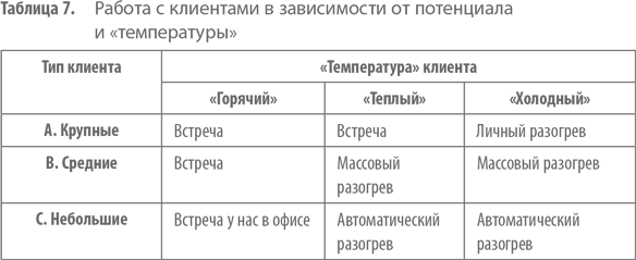 Итогом нашей совместной работы стала табл. 7 «Работа с клиентами в зависимости от потенциала и "температуры"».
