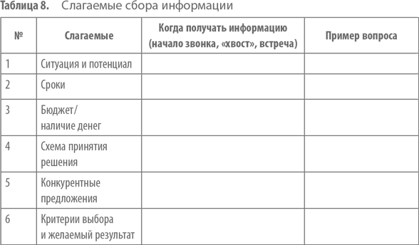 Заполните табл. 8, распределив слагаемые сбора информации по этапам контакта с клиентами: какую информацию надо получить в начале телефонного контакта (это информация, необходимая для квалификации клиента), какую на этапе «хвост», а какую – в ходе личной встречи или при последующем телефонном контакте.