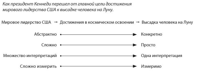 Цель Кеннеди запоминается и привлекает внимание отчасти из-за того, что она проста и конкретна: каждый гражданин США сумел понять ее (рис. 4.1). Она не требует дополнительных объяснений в отличие от фразы «Иметь космическое преимущество». Обратите внимание, как Кеннеди перешел от абстрактного («преимущество») к конкретному («человек на Луне»), от сложного («множество космических программ») к простому («отправить человека на Луну и безопасно доставить его на Землю»).