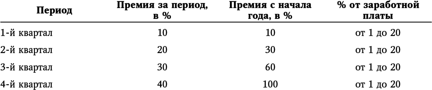 Во-вторых, будем выплачивать премии по нарастающей схеме, чтобы сотрудники не теряли интереса к процессу. Начнем с 10 процентов от премиального фонда за первый квартал, а затем увеличим эту цифру до 20 процентов за второй квартал, 30 процентов – за третий и 40 процентов – за четвертый. Кроме того, эти выплаты накапливаются: если вы не получите премию за один квартал, можно будет наверстать упущенное и заработать ее в следующем квартале.