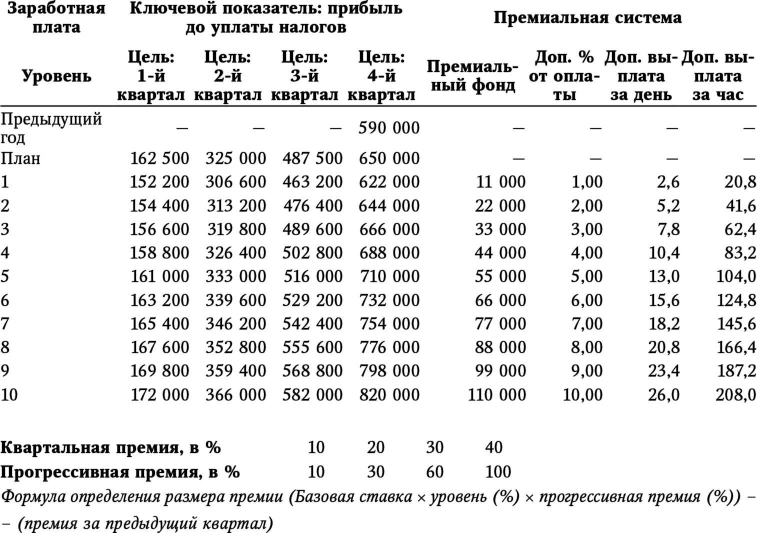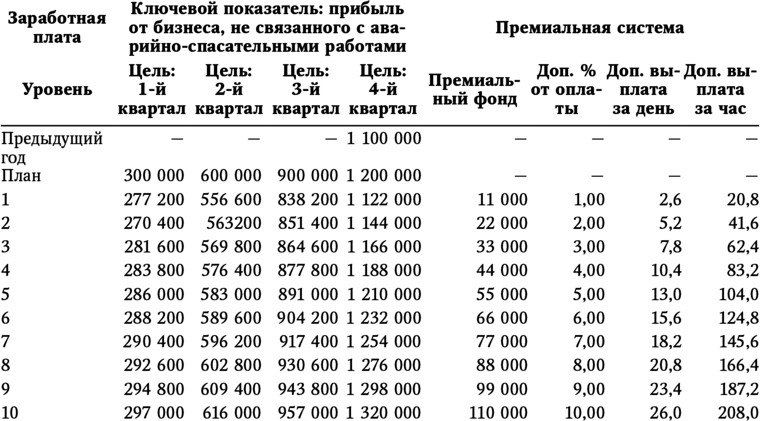 Например, если 10 процентов от заработной платы – наш максимальный уровень премии за обеспечение такого ключевого показателя, как прибыль от бизнеса, не связанного с аварийно-спасательными работами, а фонд заработной платы – 1 миллион 100 тысяч долларов, значит, наш премиальный фонд может составить максимум 110 000 долларов. Следовательно, мы должны обеспечить дополнительную валовую прибыль в размере 220 тысяч долларов, поскольку 50 процентов этой прибыли будет выплачено коллективу и 50 процентов получит компания. Итак, мы знаем максимальный размер фонда премиальных выплат. Теперь этот фонд можно разделить на десять уровней, каждому из которых соответствует 1 процент от заработной платы. Таким образом мы можем одержать множество побед!