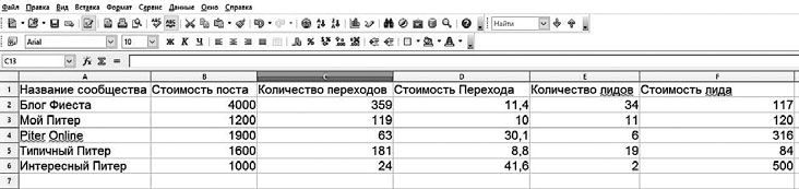 После отбора сообществ мы идем в личку к их администраторам и спрашиваем, сколько стоит одно размещение и когда есть ближайшие места. Второй вариант – используем биржу, где все эти данные находятся в открытом доступе. На выходе получаем следующую таблицу.