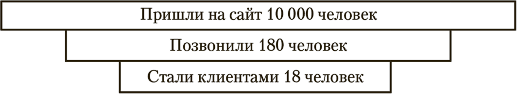 Интернет в целом и сайт в частности – это канал продаж товаров и услуг вашей компании. Поэтому необходимо оценивать эффективность работы этого канала продаж, опираясь на статистику. Первое, что необходимо сделать, – построить воронку продаж с сайта. То есть посчитать, сколько на сайт приходит человек в месяц, сколько из них позвонили по телефонам, указанным на веб-ресурсе. Дальше нужно посчитать, сколько посетителей стали клиентами.