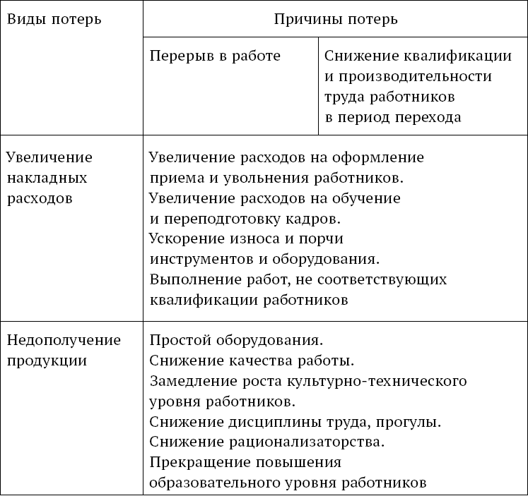 Еще в 1932 г. Н. Г. Стремлянова утверждала: «Должно стать совершенно очевидным, что текучесть и беспрерывное рассеивание опыта рабочего является одной из основных, или, вернее, самой основной причиной потерь на рабочей силе» [19]. Потери от текучести кадров складываются из увеличения накладных расходов и уменьшения выпуска продукции предприятия. Основные потери связывались со снижением квалификации принимаемых работников. К перечисленным можно добавить потери, вызванные перерывом в работе выбывающих в результате текучести кадров, а также снижением производительности труда работников в период перед увольнением и после трудоустройства. Общие потери от текучести кадров приведены в таблице 2.1.