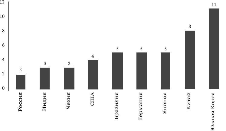 Это определяется крайне низкой производительностью труда (см. рис. 2.2). Даже среднее значение этого показателя по экономике составляет только 17 % от производительности труда в США. А в ведущих отраслях эта производительность составляет лишь 6–7 %. С этим связана и чрезвычайно низкая доля высокотехнологичных отраслей в добавленной стоимости, самая низкая даже среди стран БРИК (см. рис. 2.3).