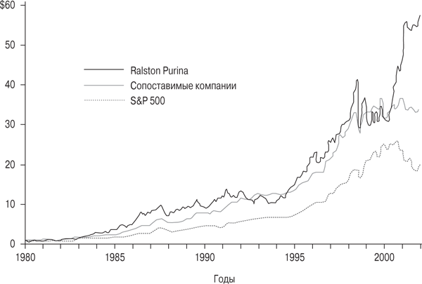 Ralston Purina, долгие годы занимавшаяся производством кормов для домашних животных, была типичным представителем этой группы и в начале 1980-х годов входила в список Fortune 100. В 1970-е под руководством СЕО Хэла Дина компания следовала тем же курсом, что и конкуренты. Она расходовала огромные средства, полученные от своего традиционного бизнеса, на программу диверсификации, в результате которой стала владелицей целого набора самых разных активов – от грибных и соевых хозяйств до сети ресторанов фастфуда Jack in the Box, хоккейной команды St. Louis Blues и горнолыжного курорта Keystone в Колорадо. На момент, когда Дин в 1980 году объявил о своем уходе, цена акций Ralston Purina не менялась в течение десяти лет.