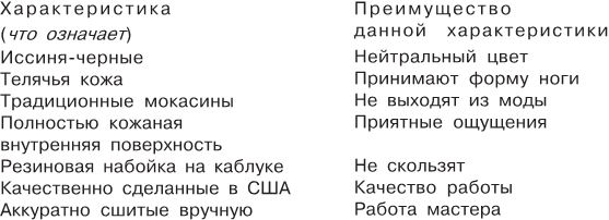 Специальное замечание: любая характеристика может иметь несколько различных преимуществ. Например, телячья кожа будет не только облегать вашу ногу, это еще и пористый материал, позволяющий ботинкам «дышать». Как определить, какое преимущество нужно использовать? Я принимаю только один ответ – выяснение потребностей.