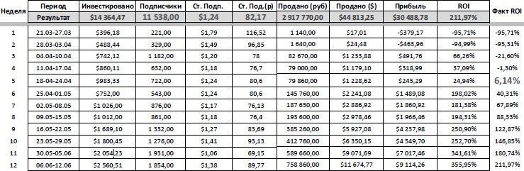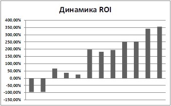 Эта аналитическая сводка демонстрирует динамику ROI – показателя возвратности инвестиций во время рекламной кампании в Google Adwords. Как видите, в первый месяц показатели окупаемости отрицательны. Большинство потенциальных клиентов еще не решилось на оплату.