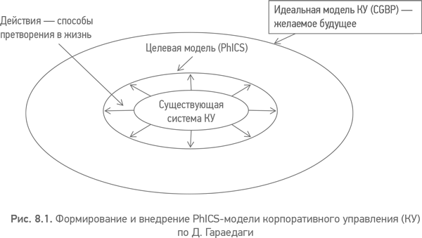 У Д. Гараедаги есть интересная схема моделирования архитектуры бизнеса, которая, после проведения мною небольших косметических изменений будет отлично применима и к описанию процесса формирования и внедрения PhICS-модели системы корпоративного управления компании{5} (рис. 8.1).