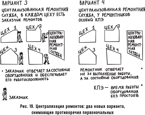 Подход 2. В цеху вводится позиция заказчика ремонтов, который головой (и карманом) отвечает за безаварийную работу оборудования, а также за стоимость ремонтов. Заказчику ремонтов даются полномочия иметь минимальный штат слесарей внутри цеха (для мелких текущих ремонтов), а также право использовать не только централизованную ремонтную службу, но и внешних подрядчиков, чтобы поддерживать оборудование в идеальном состоянии с наименьшими затратами. Большинство ремонтных работников выводится в отдельную централизованную ремонтную службу, но эта служба не становится монополистом, а руководитель цеха, имея в подчинении заказчика ремонтов с широкими полномочиями, в силах обеспечить бесперебойную работу оборудования.